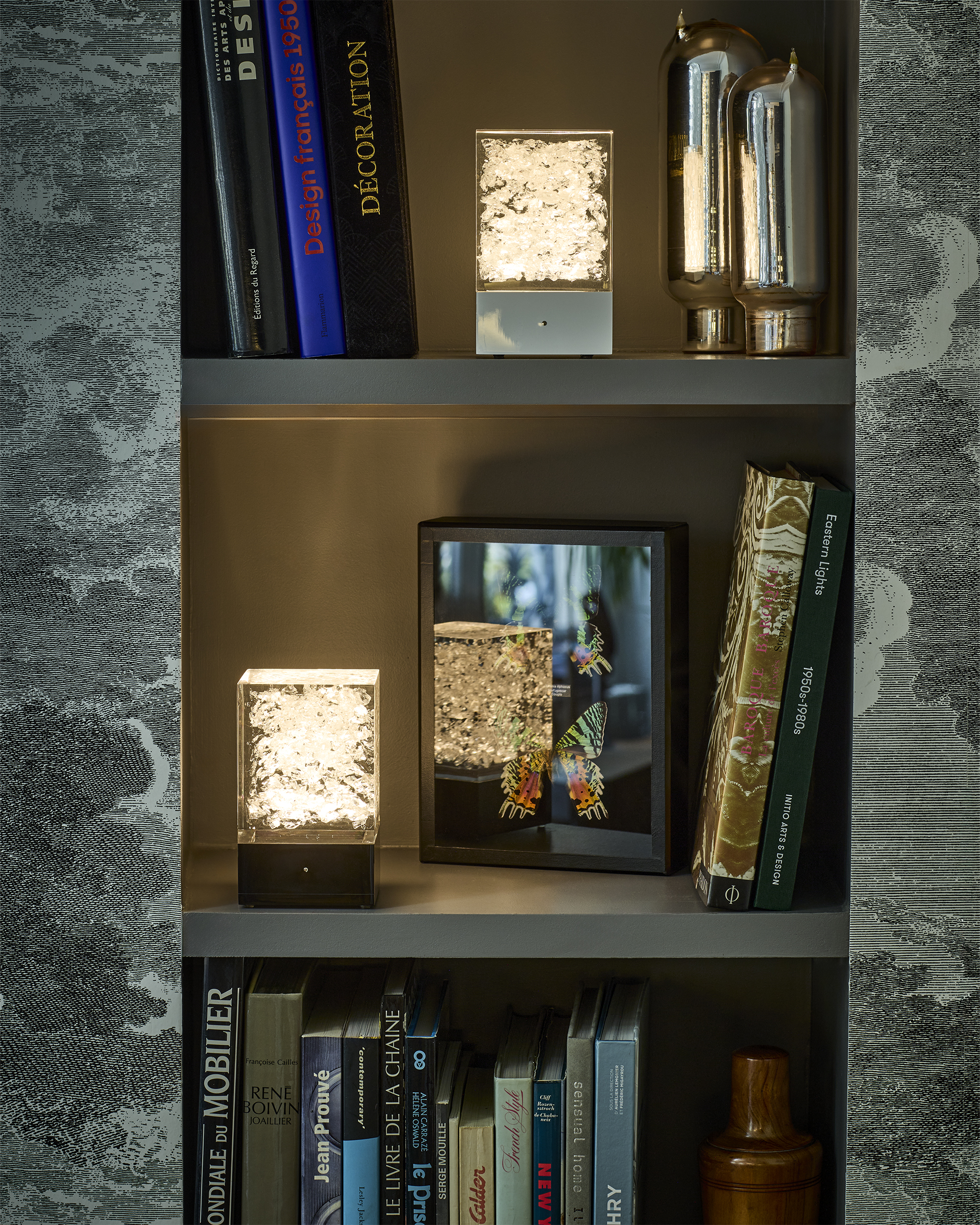 When DACRYL and HISLE reflect the light… here comes the D-cüb. This portable lamp combines design and technology to perfection. A cordless lamp with a dimmer switch that can be used in any environment, the D-cüb holds your attention and you cannot resist. An invitation to dream with its inclusions floating seamlessly in the Dacryl material.