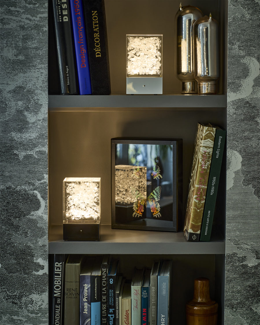 Quand DACRYL et HISLE réfléchissent la lumière…voici la D-cüb. Cette lampe nomade offre une alliance parfaite entre design et technologie. Lampe sans fil dotée d’un variateur d’intensité qui trouve sa place quel que soit l’environnement, la D-cüb interpelle et ne laisse personne indifférent. Une invitation au rêve avec ses inclusions qui flottent en toute transparence dans la matière Dacryl.