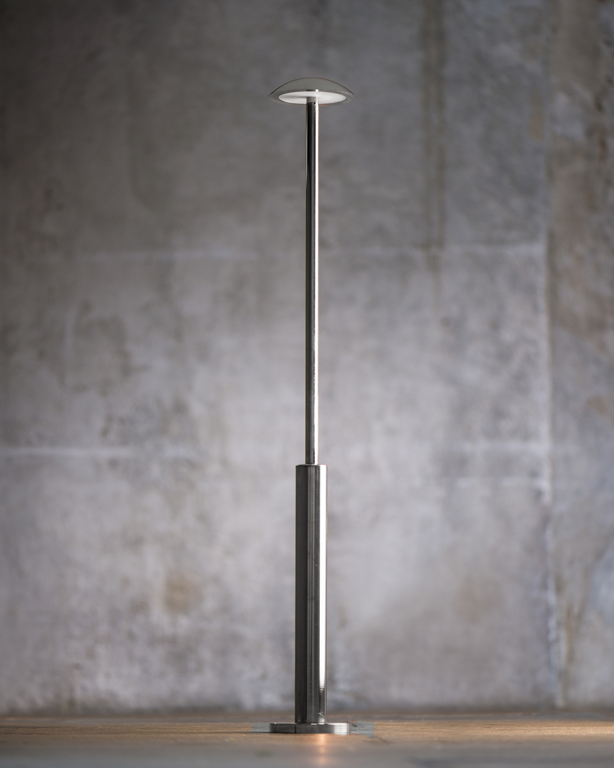 Au-dessus de sa tête, un simple petit chapeau en guise de voûte céleste. À la base, au pied, une fixation par piquet ou rondelle à fixer au sol, au choix. Entre ces deux pôles Ciel et Terre, un trait limpide, ligne graphique pleine d’aplomb et de légèreté. Le soir tombe au jardin, les bruits s’assourdissent. C’est alors qu’elle révèle sa vraie personnalité, mais aussi son indifférence à l’épreuve du temps. Destinée à accueillir une ampoule LED pour délivrer une belle et franche lumière extérieure, la ZÉNITH rend hommage à la nuit.